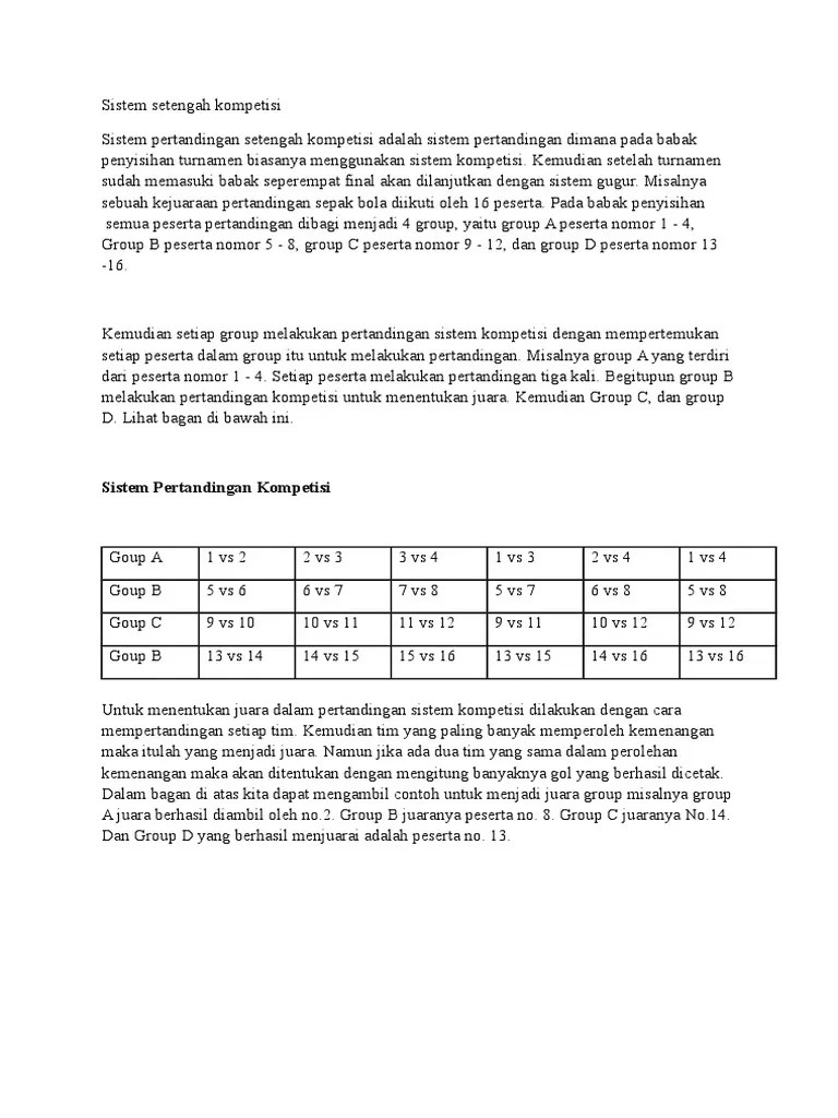 Setiap penyelenggaraan suatu even olahraga baik singgel maupun multi even, . Sistem kompetisi adalah sistem pertandingan yang dipakai dalam suatu turnamen,. Bagan organisasi, arti, macam dan cara menggambar balai pembinaan administrasi universitas . Manajemen dan sistem pertandingan olahraga i an nisha rachadiyanti apa itu manajemen. Macam macam sistem pertandingan sistem satu lawan satu sistem . Beberapa macam olahraga tergolong sistem kompetisi yaitu . Buku organisasi dan sistem pertandingan olahraga. Beberapa jenis olahraga tergolong sistem kompetisi yaitu . Sistem gugur adalah aturan yang menetapkan setiap tim akan langsung gugur jika mengalami kekalahan dalam satu pertandingan. Sistem kompetisi yaitu sistem pertandingan yang digunakan dalam suatu turnamen,. Sedang pemain/tim yang belum kalah dapat melanjutkan pertandingan sampai final. Pada sesi ini kita akan membahas lebih dalam jenis sistem gugur pada bagan pertandingan secar alebih mendalam. By purnama monday, february 24, 2014.